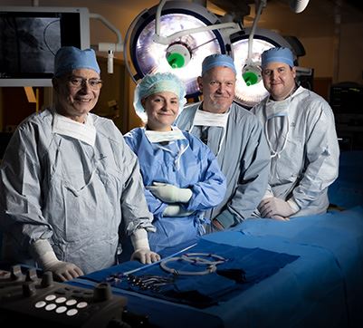 Photo: Independence Health System thoracic surgeons Michael Szwerc (left) and Brian Lace (far right) with Kirby Thornton, Respiratory Care Services, ...
